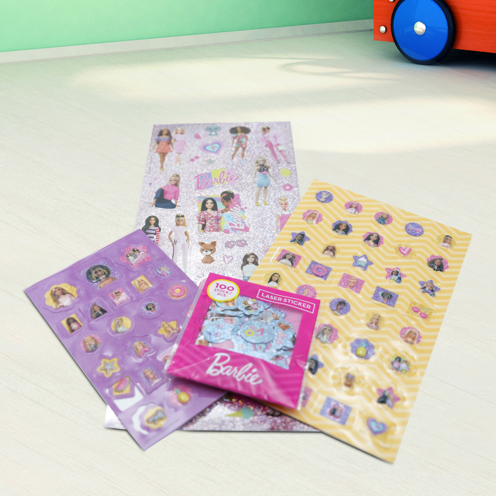 Also included are 100+ shimmering laser stickers that bring sparkle and glam to any creative project. The stickers are easy to peel and reposition, making them perfect for small hands and repeat use. Kids can dress up their favorite Barbie characters, create scenes on paper, or share their designs with friends for group fun.