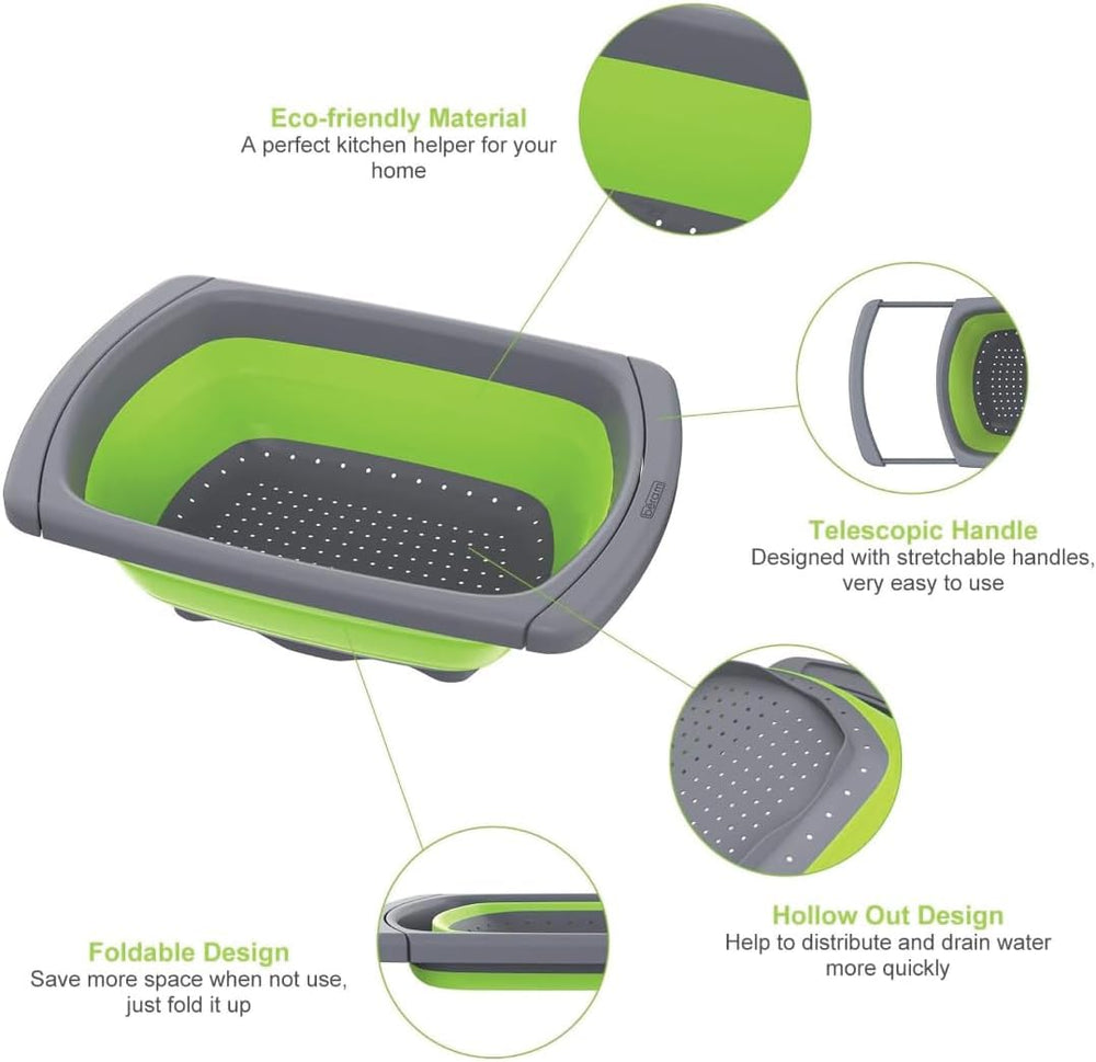 Introducing our Versatile Collapsible Colander – a kitchen essential that adapts to your needs! Whether over a sink, in a sink, or freestanding, its clever design collapses with a single push for easy storage. With an impressive 6-quart capacity, it handles pasta, veggies, fruits, and more. Crafted with robust and non-slip features, it ensures stability and durability. Made from healthy, odor-free materials, this colander is environmentally friendly. Its quadrilateral shape allows convenient stacking, perfect for saving space in your kitchen or packing for RV trips. Heat-resistant and dishwasher safe, cleanup is a breeze. The robust and ergonomic design, complete with non-slip handles, ensures stability and enhances your cooking experience. This multipurpose tool is not just for straining – use it for rinsing grains, draining canned foods, or as a portable fruit basket on picnics. Enjoy a hassle-free and efficient kitchen experience with our Collapsible Colander! Upgrade your kitchen with this versatile and efficient kitchen tool.