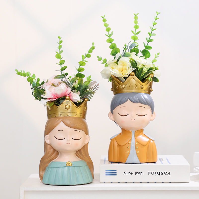 Beram King and Queen Planter Set Polyresin Decorative Flower Vase Royal Couple Succulent Pot Cute Crown Design Indoor Outdoor Home Office Decor Pen Pencil Holder Gift