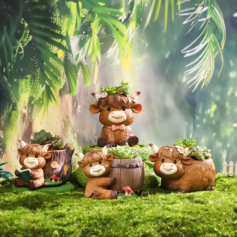 Beram Scottish Highland Candle Cow-Barrel Flower Pot Polyresin Cute Cow Succulent Planter Decorative Mini Barrel Vase Indoor Outdoor Garden Desk Home Office Decor Pen Pencil Holder Propagator Kit