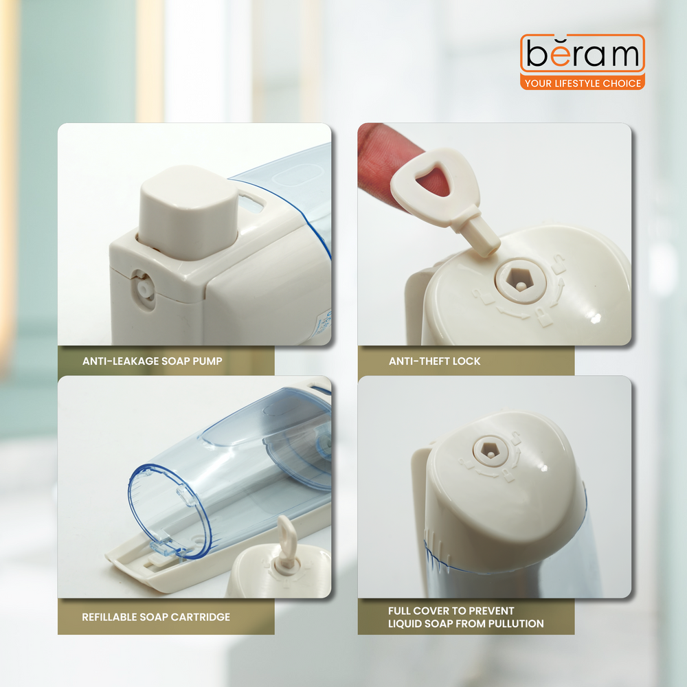 BERAM White Manual Soap Dispenser 300 ml Wall Mounted Push Type soap Dispenser Bathroom & Kitchen Easy Refill Leak-Proof Design Perfect for Soap Shampoo Hand Sanitizer transparent Tank ABS Plastic