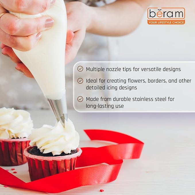 Unleash your creativity in the kitchen with the BERAM 24-Piece Stainless Steel Cake Decorating Set. Whether you’re a beginner baker or a pastry pro, this versatile icing set makes it easy to craft beautiful borders, flowers, swirls, and detailed designs on cakes, cupcakes, cookies, and pastries. Crafted from premium food-grade stainless steel, the piping nozzles are durable, rust-resistant, and easy to clean. Each set comes neatly organized in a reusable storage box to keep your tips secure and tidy. The kit also includes standard-sized couplers and reusable piping bags for quick nozzle changes and seamless decorating.