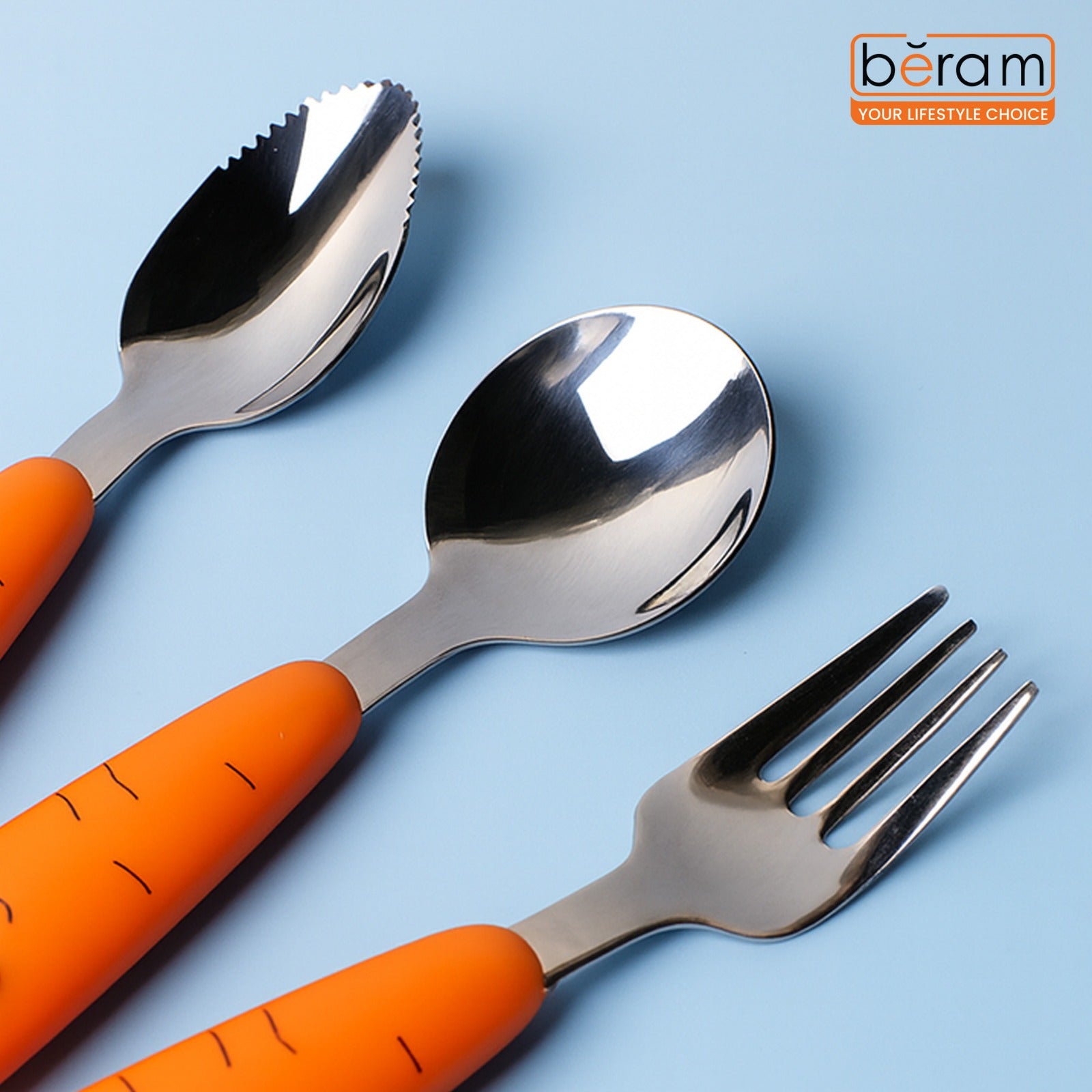 Introducing the delightful Rabbit Rapier Cutlery set by Beram, designed specifically with children in mind. Each piece features whimsical orange carrot designs that adorn the handles, adding a playful touch to mealtime. Crafted from premium 18/10 grade stainless steel, this set ensures durability and safety, making it suitable for little hands. The compact size of the cutlery set is perfect for young diners, encouraging independence and enjoyment during meals. Whether it's breakfast, lunch, or dinner, this charming set adds a delightful element of fun to any dining experience.