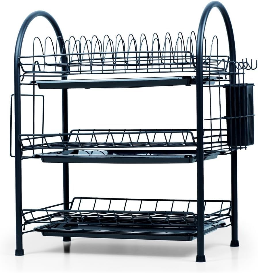 This 3-tier dish drying rack is the perfect solution for organizing and drying your kitchen essentials. With its smart storage design, it saves valuable counter space while keeping your dishes, cups, bowls, knives, forks, and cutting boards neatly organized and dry. The dual-layer design allows for efficient air circulation, ensuring your items dry quickly. Constructed with sturdy, rust-proof materials, this dish drainer is built to last. Its large capacity accommodates a substantial number of items, yet maintains a compact footprint. The detachable components make it easy to customize the layout to suit your needs. Bring a neat aesthetic to your kitchen countertop with this versatile dish-drying rack. Dimensions: 46cm x 33cm x 33cm (18.1in x 13in x 13in). Hand-wash is recommended for easy maintenance.