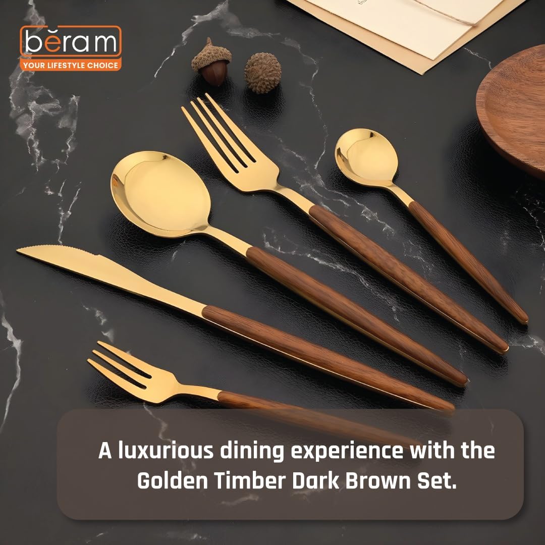 BERAM Golden Timber 5-Piece Cutlery Set – Gold Stainless Steel Flatware with Brown Wooden Handles – Elegant Dinnerware for Daily Use