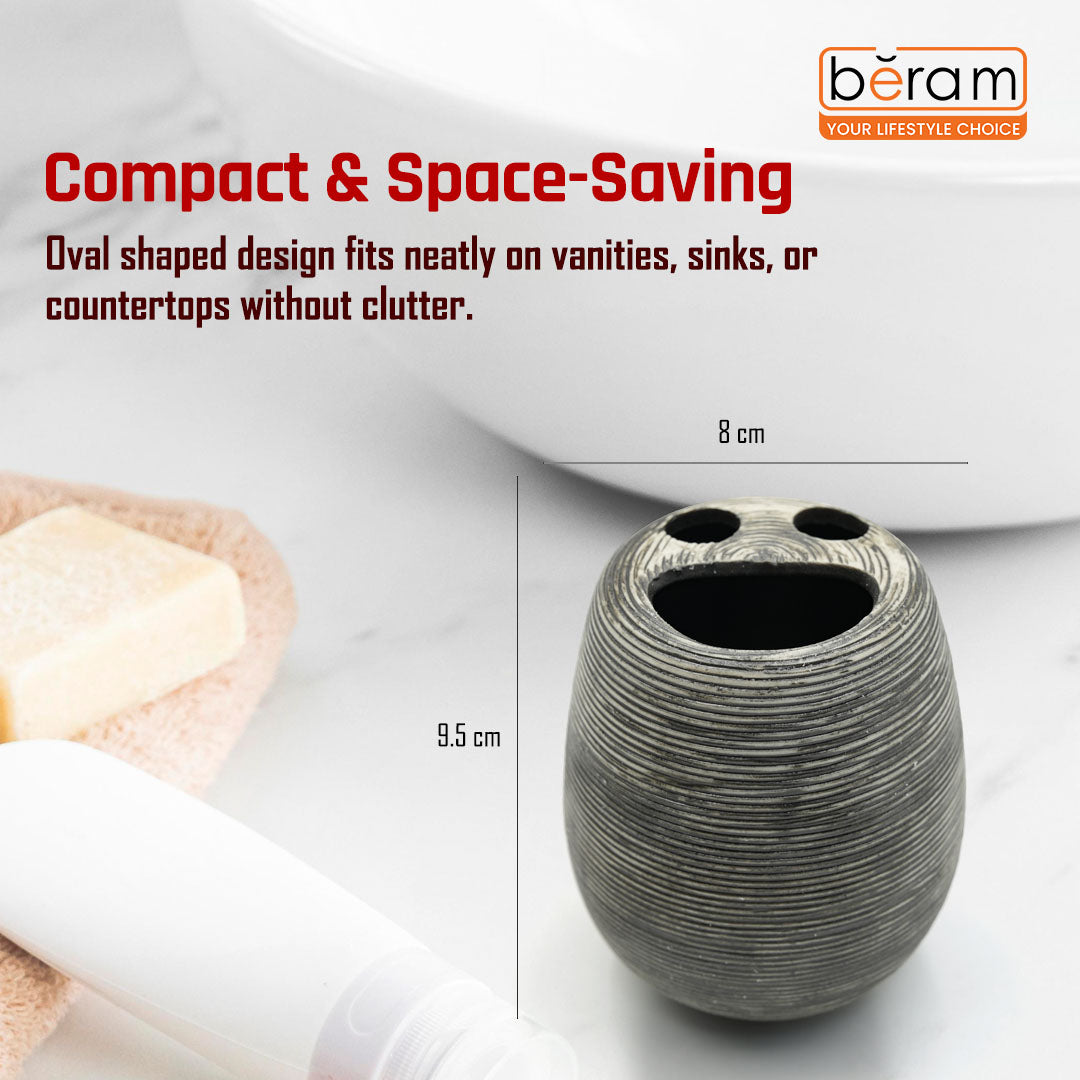 This thoughtfully curated set includes five essential accessories: a sleek soap dispenser with a metallic pump, a classic tumbler, a toothbrush holder with dual slots, a multifunction holder perfect for razors or makeup brushes, and a soap dish with a matching ridged finish. Every piece is crafted from durable ceramic and coated in a matte glaze that’s water-resistant and easy to clean.