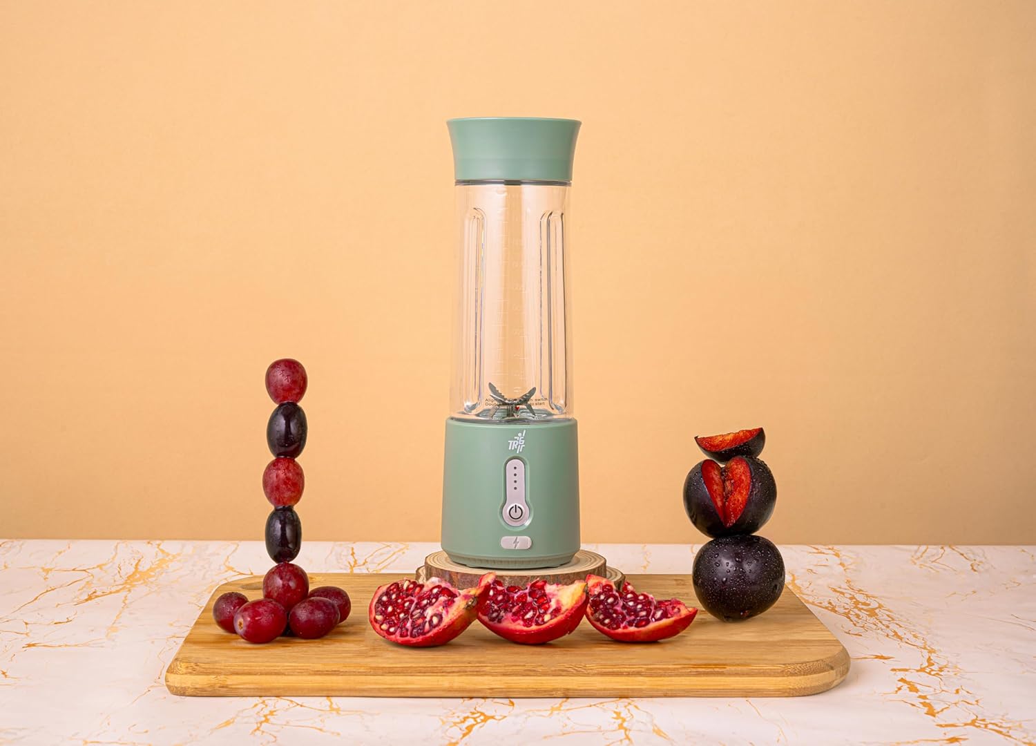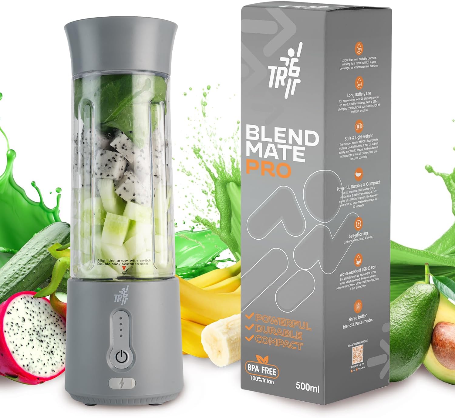TR6 Blendmate Pro with 4000mAh Battery – 500ML Capacity Discover the perfect blend of portability, performance, and style with this innovative portable blender. Crafted to meet your on-the-go blending needs, it features food-grade Tritan for safe, durable use and a unique lid shaped as a handle for ultimate convenience. These standout features set this blender apart from the competition, offering a practical and high-quality solution for your daily blending. Key Features: 1.Food-Grade Tritan Material: Made from BPA-free, non-toxic Tritan plastic, ensuring your beverages are safe, clean, and taste as intended. It’s lightweight yet durable, making it perfect for everyday use. 2.Portable Lid with Handle: The innovative lid is designed as a convenient handle, allowing you to easily carry the bottle and enjoy your blended drinks wherever you go—no need to carry the whole Blender. 3.Powerful 4000mAh Battery: Offers long-lasting performance for multiple blends on a single charge, ideal for traveling, commuting, or outdoor activities. 4.High-Speed Motor (540/7.4V): With speeds up to 18,000 RPM (without load) and 1600 RPM (with load), this motor handles fruits, vegetables, and even ice with ease for smooth, consistent results. 5.500ML Capacity: Perfectly sized for single servings of smoothies, shakes, and other blended drinks—just the right amount for a quick snack or meal replacement. 6.Waterproof Design: IPX6-rated, making it easy to clean and reliable for use in all conditions, whether at home or on the go. 7.USB-C Charging Port: Quick and efficient charging, ensuring your blender is ready when you need it. 8.Package Includes: Blender device, USB cable, cleaning brush, portable lid with handle, and user manual.